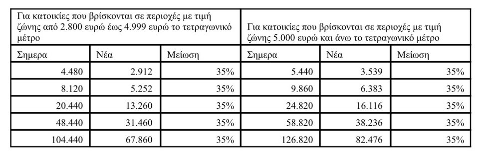 Μέχρι τώρα, οι παραπάνω συντελεστές προσαυξάνονταν, προκειμένου για κατοικίες που βρίσκονται σε περιοχές με τιμή ζώνης από 2.800 ευρώ έως 4.999 ευρώ το τετραγωνικό μέτρο, κατά 40% και για περιοχές με τιμή ζώνης από 5.000 ευρώ και άνω το τετραγωνικό μέτρο, κατά 70%.