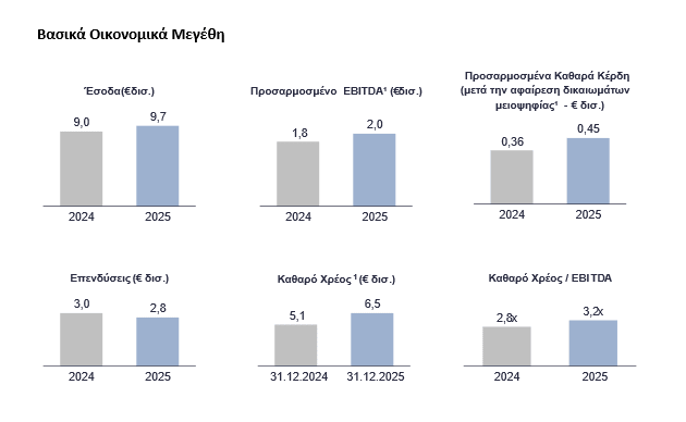 Ισχυρή χρηματοοικονομική θέση, παρά τις υψηλές επενδύσεις. Ο δείκτης Καθαρό Χρέος/EBITDA διαμορφώθηκε σε 3,2x, αντανακλώντας το υψηλότερο επίπεδο επενδύσεων, παραμένοντας ωστόσο κάτω από το όριο του 3,5x που έχει θέσει ο Όμιλος ως ανώτατο όριο στο πλαίσιο της χρηματοοικονομικής πολιτικής του, με τον καθαρό δανεισμό να διαμορφώνεται σε €6,5 δισ. στις 31.12.2025.