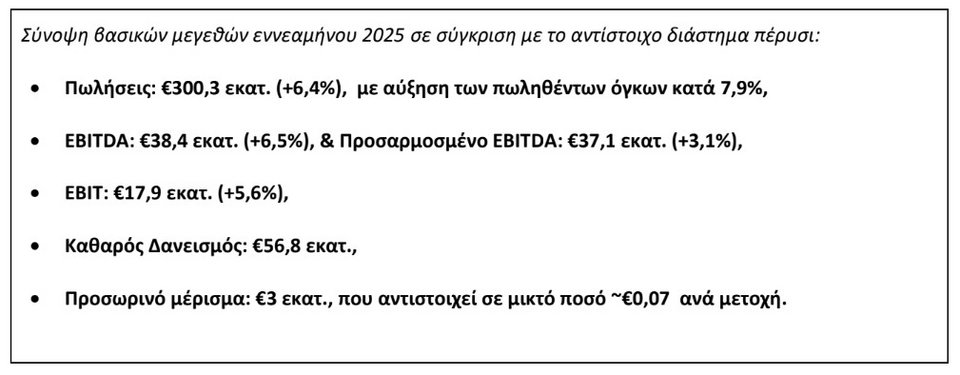 Η λειτουργική κερδοφορία κατέγραψε σημαντική πρόοδο. Το EBITDA ανήλθε σε €38,4 εκατ., αυξημένο κατά 6,5% σε σχέση με το αντίστοιχο διάστημα του 2024, ενώ το προσαρμοσμένο EBITDA διαμορφώθηκε σε €37,1 εκατ. σημειώνοντας αύξηση 3,1%. Η αύξηση αυτή αποκτά ιδιαίτερη σημασία δεδομένης της μειωμένης ζήτησης σε συγκεκριμένους κλάδους και της ανόδου της κοστολογικής βάσης, με το ενεργειακό κόστος να είναι υψηλότερο κατά περίπου €2,1 εκατ. σε σχέση με πέρυσι.