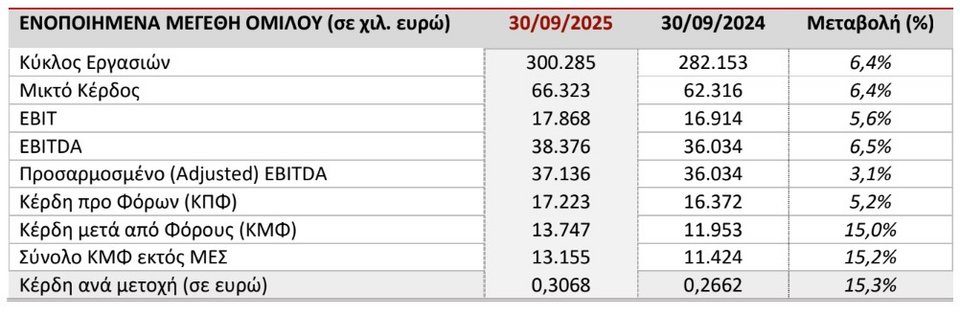 Ειδικότερα, στον πίνακα παρουσιάζονται τα βασικά οικονομικά μεγέθη του Ομίλου για το εννεάμηνο του 2025, σε σχέση με την αντίστοιχη περίοδο του 2024: