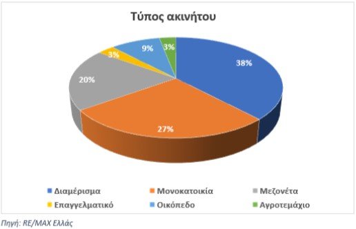 Με βάση τα στοιχεία της έρευνας της RE/MAX Ελλάς για το 2025, οι προτιμήσεις των ξένων αγοραστών ως προς τον τύπο ακινήτου ποικίλλουν. Τα διαμερίσματα καλύπτουν το 38% των αγορών, με τις μονοκατοικίες να ακολουθούν στο 27% και τις μεζονέτες στο 20%. Στο 3% περιορίζονται οι αγορές επαγγελματικών ακινήτων, ενώ τα οικόπεδα αντιστοιχούν στο 9% και τα αγροτεμάχια στο 3%.