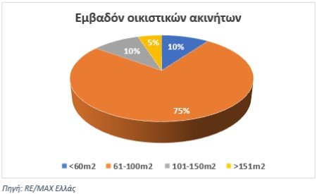 Αναφορικά με το εμβαδόν των οικιστικών ακινήτων που επέλεξαν οι ξένοι αγοραστές, η κατηγορία εκείνων που έχουν εμβαδόν από 61 τ.μ. έως 100 τ.μ. καταλαμβάνει το 75% των αγορών, καλύπτοντας τόσο επενδυτικές ανάγκες όσο και ιδιοκατοίκησης. Η κατηγορία ακίνητων εμβαδού έως 60 τ.μ. επιλέχθηκε από το 10% του συνόλου των ξένων αγοραστών, ενώ το ίδιο ποσοστό εμφανίζεται και για την απόκτηση ακινήτων επιφάνειας από 101 τ.μ. έως 150 τετραγωνικών μέτρων. Από την άλλη, ακίνητα άνω των 151 τ.μ. προσέγγισαν το ενδιαφέρον μόλις του 5% των ξένων αγοραστών.