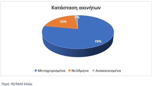 Όσον αφορά στην κατάσταση των οικιστικών ακινήτων, η συντριπτική πλειονότητα των ξένων αγοραστών (ποσοστό 78% επί του συνόλου) επέλεξε μεταχειρισμένα ακίνητα. Τα νεόδμητα καλύπτουν το 20% των αγορών και τα ανακαινισμένα μόλις το 2%.