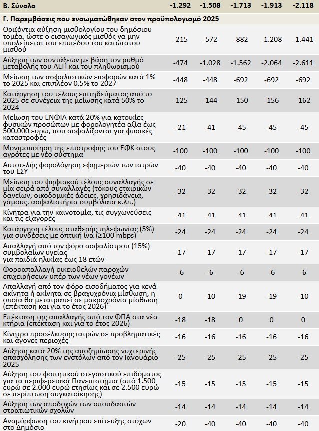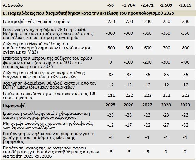 Όμως, το συνολικό κόστος των δημοσιονομικών παρεμβάσεων που έχουν νομοθετηθεί ή ανακοινωθεί για το σύνολο της περιόδου 2025-2029, ανέρχεται σε 3,04 δισ. ευρώ για το 2025, αυξανόμενο σε 5,94 δισ. ευρώ το 2026 (επιπλέον 2,9 δισ. ευρώ σε σχέση με το 2025), σε 7,94 δισ. ευρώ το 2027 (επιπλέον 2 δισ. ευρώ σε σχέση με το 2026), σε 9,01 δισ. ευρώ το 2028 (επιπλέον 1,07 δισ. ευρώ σε σχέση με το 2027) και σε 10,1 δισ. ευρώ το 2029 (επιπλέον 1,09 δισ. ευρώ σε σχέση με το 2028).