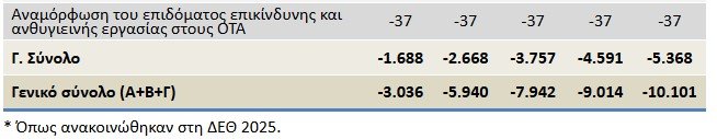 - ενίσχυση των στελεχών των Ενόπλων Δυνάμεων και των Σωμάτων Ασφαλείας με το επίδομα ιδιαίτερων συνθηκών εργασίας και επικινδυνότητας ύψους 100 ευρώ μηνιαίως, με εκτιμώμενο συνολικό κόστος 111 εκατ. ευρώ για το 2025 και 222 εκατ. ευρώ για το 2026.