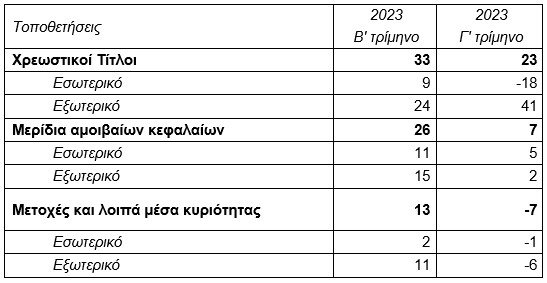 Η αξία των συνολικών τοποθετήσεων των Ταμείων σε χρεωστικούς τίτλους αυξήθηκε στα 997 εκατ. ευρώ στο τέλος του γ΄ τριμήνου του 2023, έναντι 977 εκατ. ευρώ το προηγούμενο τρίμηνο. Η εξέλιξη αυτή οφείλεται κυρίως σε αγορές κυβερνητικών ομολόγων των λοιπών χωρών της ζώνης του ευρώ. Το ποσοστό των χρεωστικών τίτλων επί του συνολικού ενεργητικού αυξήθηκε στο 48,8% το γ΄ τρίμηνο, έναντι 48,4% το προηγούμενο τρίμηνο.