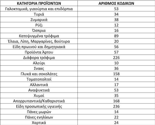 Ενδεικτικά, αναφέρεται ότι στην πρωτοβουλία περιλαμβάνονται 1.074 κωδικοί τροφίμων και 1.106 κωδικοί μη τροφίμων: