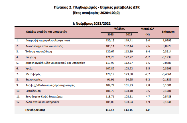 Την μεγαλύτερη αύξηση συγκριτικά με τον Νοέμβριο του 2022 παρουσίασε η κατηγορία των προίόντων διατροφής με 9%, ακολουθούμενη από την ένδυση και υπόδηση με 6,4%, τις υπηρεσίες υγείας με 5,5% και τις τιμές ξενοδοχείων και καφεστιατορίων με 4,7%.