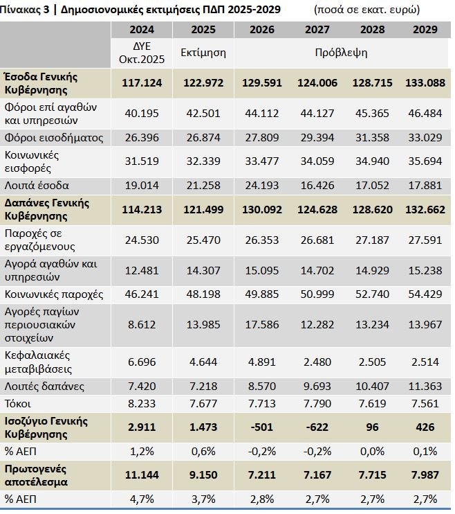 Τα έτη 2026-2029 το δημοσιονομικό αποτέλεσμα εκτιμάται ότι θα είναι σχεδόν ισοσκελισμένο, σημαντικά υψηλότερο από την τιμή αναφοράς -3% του ΑΕΠ του Συμφώνου Σταθερότητας.