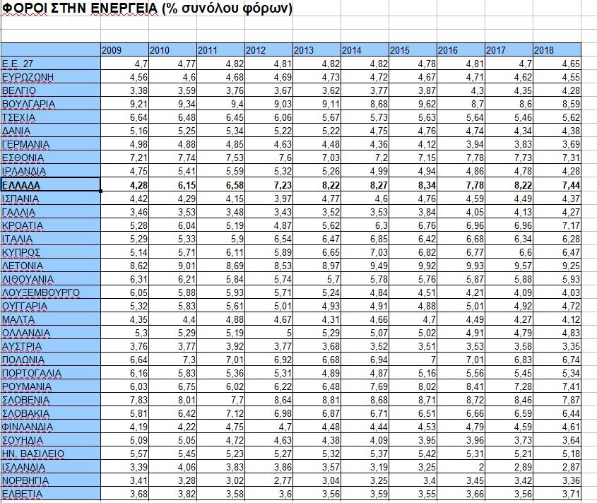 Πάνω από 7% οι φόροι στην Ελλάδα για την ενέργεια