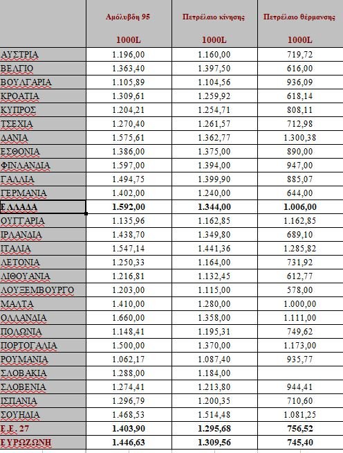 Η εικόνα των επιβαρύνσεων γίνεται ακόμα πιο καθαρή, εάν ανατρέξει κανείς στα συγκριτικά στοιχεία για τις λιανικές τιμές των καυσίμων ανά την Ευρώπη. Η σύγκριση δείχνει ότι η Ελλάδα κάνει... πρωταθλητισμό, ανταγωνίζεται στα... ίσα τις πλούσιες χώρες του Βορρά κι αυτό σημαίνει πολύ απλά ότι οι Έλληνες επιβαρύνονται δυσανάλογα σε σχέση με την αγοραστική τους δύναμη. Το crash test δείχνει ότι η απλή αμόλυβδη στην Ελλάδα φτάνει κατά μέσο όρο στα 1,592 ευρώ/λίτρο, δηλαδή 19 ολόκληρα λεπτά πάνω από το μέσο κοινοτικό όρο. Με αυτήν... επίδοση, οι Έλληνες πληρώνουν την 3η ακριβότερη βενζίνη στην Ευρωζώνη...