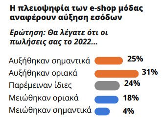 Φαίνεται πως η μείωση της αγοραστικής δύναμης δεν κατάφερε να πλήξει εν τέλει τα ηλεκτρονικά καταστήματα μόδας, αφού το 56% των e- shop που συνεργάζονται με το GLAMI ανέφεραν αύξηση των εσόδων τους (σε σύγκριση με το 47% στην αντίστοιχη ερώτηση της έρευνας συνεργατών του GLAMI για το 2021). Για το 24% τα έσοδα παρέμειναν ίδια, ενώ το 22% ανέφερε μείωση.