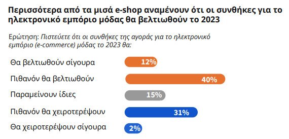 Το 2023 είναι αναμφίβολα έτος προκλήσεων. Η παγκόσμια βιομηχανία της μόδας ανέκαμψε απότομα το 2021 και κατά το μεγαλύτερο μέρος του 2022. Αλλά στη σημερινή εύθραυστη πραγματικότητα, οι προσδοκίες για συνεχή ανάκαμψη μπορεί να ανατραπούν πολύ γρήγορα. Παρόλα αυτά, οι Έλληνες εκπρόσωποι του fashion ecommerce παραμένουν σε μεγάλο βαθμό αισιόδοξοι για το επόμενο έτος. Στην έρευνα του GLAMI, το 40% πιθανολογεί ότι θα υπάρξει βελτίωση ενώ ένα 12% αναμένει σίγουρα βελτίωση. Σε αντίθεση, μόλις το 2% αναμένει σίγουρα αρνητικά αποτελέσματα.
