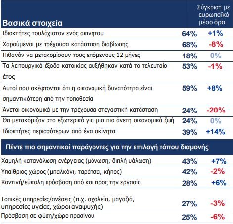Επιπλέον, το 68% των ερωτηθέντων αισθάνονται χαρούμενοι με τη σημερινή κατάσταση διαβίωσής τους, ενώ το 24% αισθάνονται άνετα οικονομικά με την τρέχουσα στεγαστική τους κατάσταση, εξαιτίας της γενικότερης οικονομικής συγκυρίας, με το ποσοστό αυτό να είναι μειωμένο κατά 20% σε σχέση με τον ευρωπαϊκό μέσο όρο. Πολύ χαμηλότερο είναι το ποσοστό εκείνων που δηλώνουν ότι αισθάνονται άνετα με το ενεργειακό κόστος (17%).