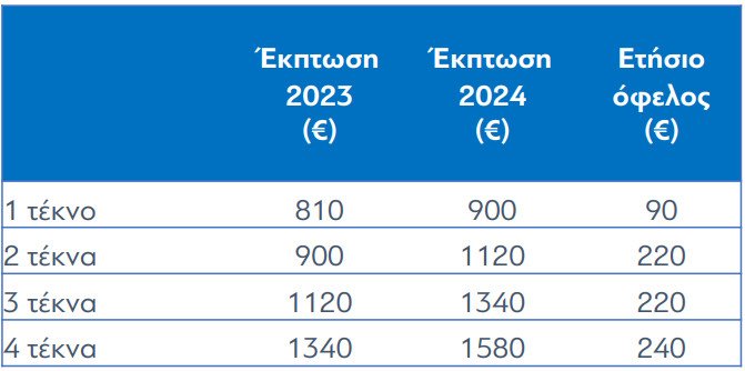 Ωφελημένοι από τη νέα χρονιά θα είναι και οι φορολογούμενοι με παιδιά, καθώς αυξάνεται κατά 1.000 ευρώ το αφορολόγητο, μέσω της αναπροσαρμογής της έκπτωσης φόρου. Ενδεικτικά, το όφελος για οικογένειες με δύο παιδιά είναι 220 ευρώ τον χρόνο. Το μέτρο υπολογίζεται ότι αφορά σε περίπου 1,34 εκατ. φορολογούμενους.