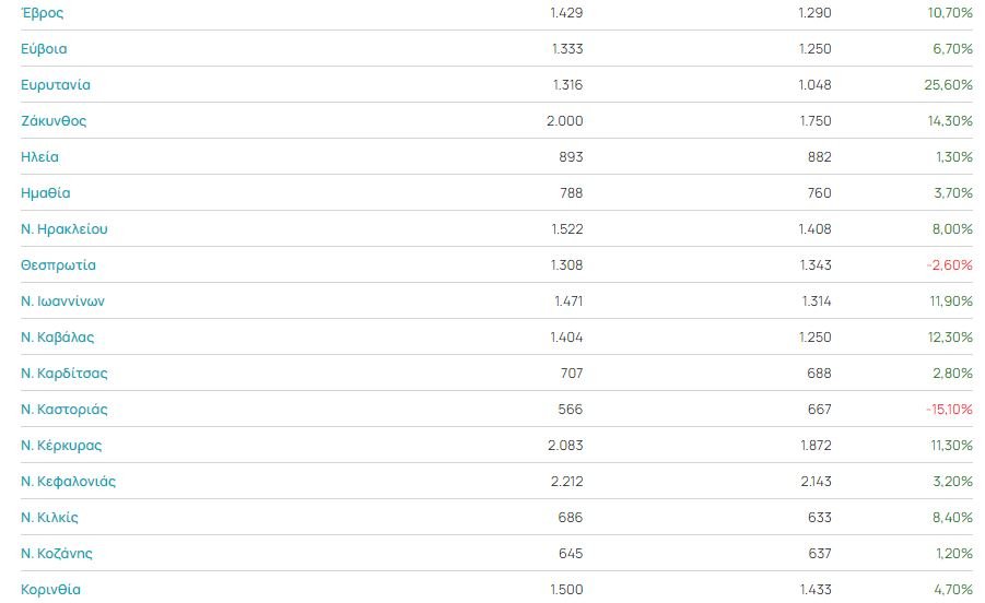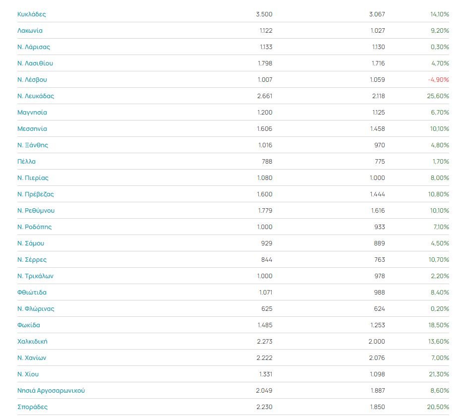 Ακολουθούν η Ευρυτανία και η Λευκάδα με αύξηση 25,60%, τα προάστια Πειραιά με +25%, η Χίος με +21,30% και οι Σποράδες με +20,50%.