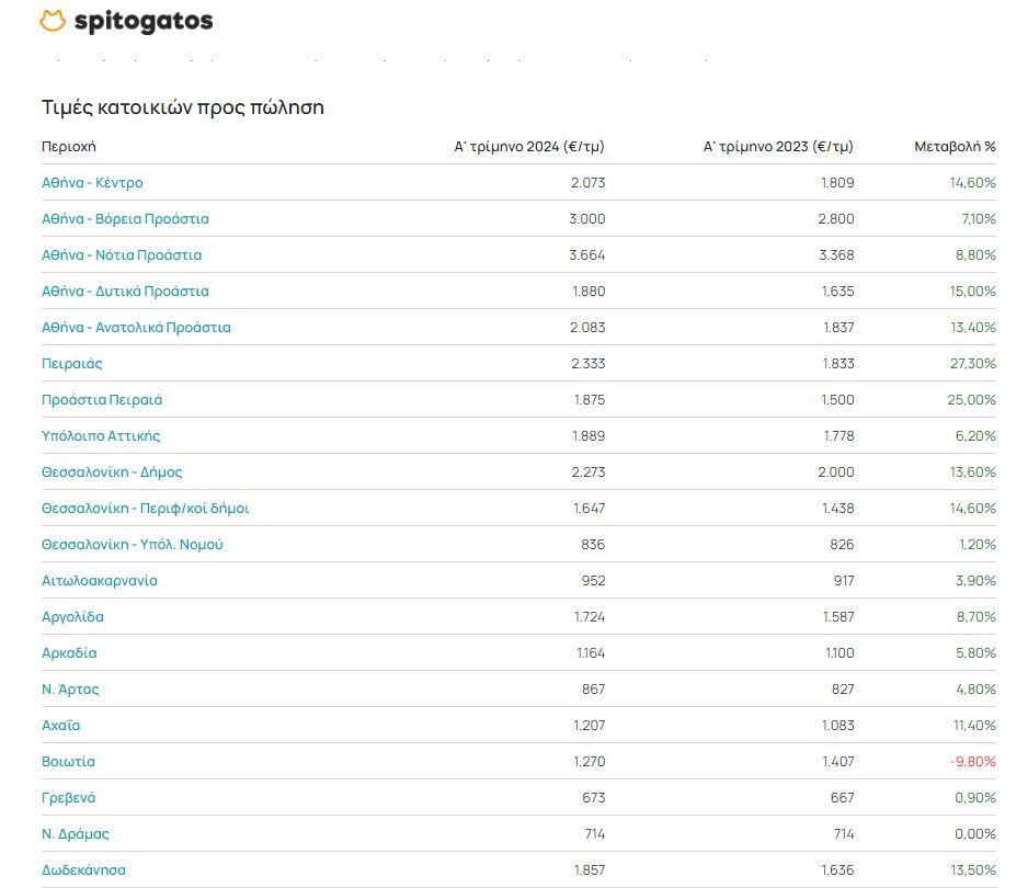 Στην Αθήνα, αύξηση 15% σημείωσαν οι τιμές πώλησης στα Δυτικά Προάστια, 14,60% στο κέντρο, 13,40% στα Ανατολικά Προάστια, 8,80% στα Νότια Προάστια και 7,10% στα Βόρεια Προάστια.