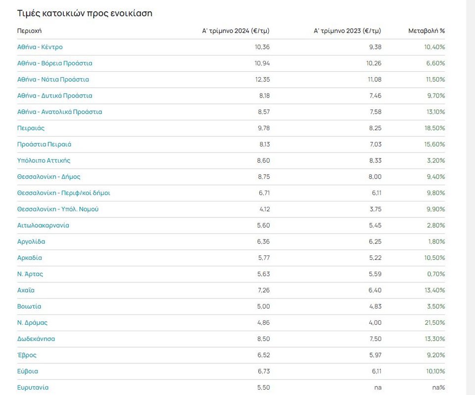 Η μεγαλύτερη αύξηση το α' τρίμηνο του 2024 στις τιμές ενοικίων εντοπίζεται στις Σέρρες με +24,60% και ακολουθούν η Δράμα με +21,50% και η Ξάνθη με +20%.