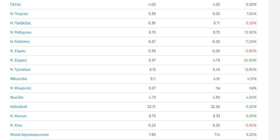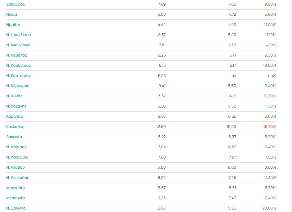 Μειώσεις παρατηρήθηκαν επίσης στο Κιλκίς με -13,30%, στην Πρέβεζα με -5,20%, στην Μεσσηνία με -2,40%, στην Σάμο με -0,80% και στην Χίο με -0,50%.
