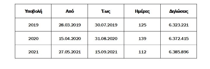 Σύμφωνα με στοιχεία που ανακοίνωσε η ΑΑΔΕ -η οποία παρουσίασε, στο μεταξύ, και τον «διάδοχο» του Taxisnet, την πλατφόρμα myAADE- φέτος υποβλήθηκαν εμπρόθεσμα 6.385.896 δηλώσεις, μέσα σε 112 ημέρες. «Πρόκειται για τον μεγαλύτερο αριθμό δηλώσεων, που έχει υποβληθεί εμπρόθεσμα και μάλιστα στο μικρότερο χρονικό διάστημα» αναφέρει η ΑΑΔΕ, υπενθυμίζοντας ότι η προθεσμία πλέον έχει λήξει και πως δεν μπορούν να υποβάλλονται εμπρόθεσμα φορολογικές δηλώσεις.