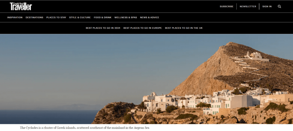 Σε αφιέρωμα του γνωστού οδηγού Conde Nast Traveller, για τους 12 καλύτερους προορισμούς στην Ευρώπη για το 2024, οι Κυκλάδες φιγουράρουν στις πρώτες θέσεις, με μια εντυπωσιακή φωτογραφία από τη Φολέγανδρο. “Υπάρχει κάτι πιο δημοφιλές από τα ελληνικά νησιά αυτή τη στιγμή; Το περασμένο καλοκαίρι, οι Κυκλάδες - ένα νησιωτικό σύμπλεγμα που περιλαμβάνει τη Μύκονο, τη Σαντορίνη, την Πάρο, τη Μήλο και την Ίο - κυριάρχησαν στα μέσα κοινωνικής δικτύωσης με όμορφα γαλανόλευκα σκηνικά, συναρπαστικά beach clubs και νυχτερινά κέντρα και ωραία καταστήματα. Με περισσότερες έξυπνες διαμονές που θα παρουσιαστούν το 2024, και νέες πτήσεις, το επόμενο καλοκαίρι είναι η κατάλληλη στιγμή για να πραγματοποιήσετε ένα ταξίδι στις Κυκλάδες”, σημειώνει ο Οδηγός, δίνοντας... ραντεβού στους επισκέπτες της επόμενης σεζόν.