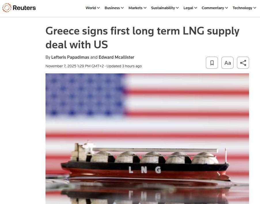 Όπως σημειώνει το δημοσίευμα, η Ελλάδα υπέγραψε συμφωνία για την εισαγωγή 0,7 δισεκατομμυρίων κυβικών μέτρων υγροποιημένου φυσικού αερίου ετησίως από το 2030, στην πρώτη μακροπρόθεσμη συμφωνία προμήθειας φυσικού αερίου με τις ΗΠΑ.