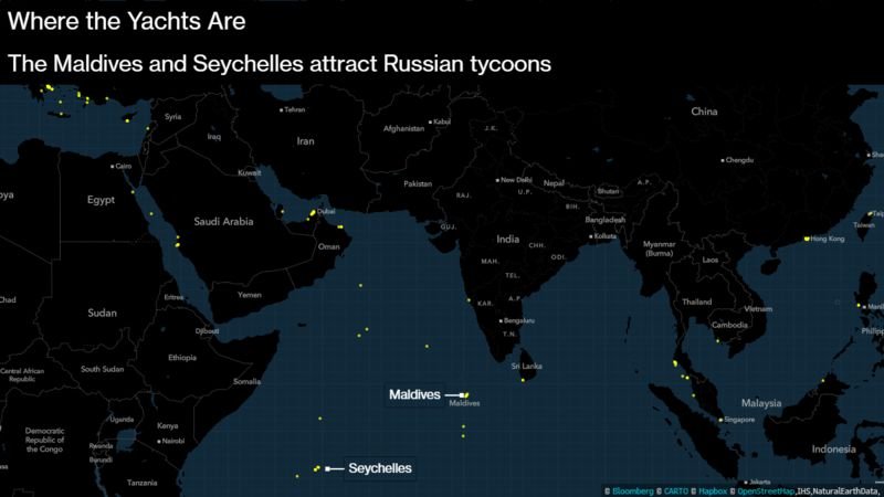 Τουλάχιστον πέντε σούπερ γιοτ που ανήκουν σε Ρώσους δισεκατομμυριούχους αγκυροβόλησαν ή έκαναν κρουαζιέρες την Τετάρτη στις Μαλδίβες, ένα νησιωτικό έθνος του Ινδικού Ωκεανού που δεν έχει υπογράψει συνθήκη έκδοσης με τις Ηνωμένες Πολιτείες, όπως έδειξαν στοιχεία παρακολούθησης πλοίων. Η άφιξη των πλοίων στο αρχιπέλαγος, στα ανοικτά των ακτών της Σρι Λάνκα, ακολουθεί την επιβολή αυστηρών δυτικών κυρώσεων στη Ρωσία, ως αντίποινα για την εισβολή της στην Ουκρανία στις 24 Φεβρουαρίου.