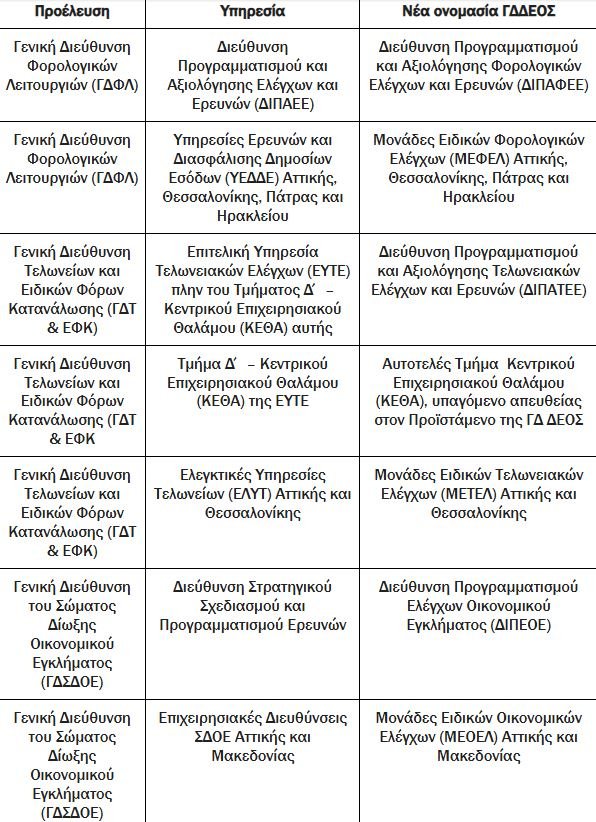 Η νέα Γενική Διεύθυνση προκύπτει από τη μετεξέλιξη της μέχρι σήμερα Γενικής Διεύθυνσης του Σώματος Δίωξης Οικονομικού Εγκλήματος (ΓΔΣΔΟΕ) και ενισχύεται σημαντικά με τη μεταφορά σε αυτή ελεγκτικών μονάδων από τη Γενική Διεύθυνση Φορολογικών Λειτουργιών (ΓΔΦΛ) και τη Γενική Διεύθυνση Τελωνείων και Ειδικών Φόρων Κατανάλωσης (ΓΔΤ & ΕΦΚ), όπως αποτυπώνεται στον ακόλουθο πίνακα: