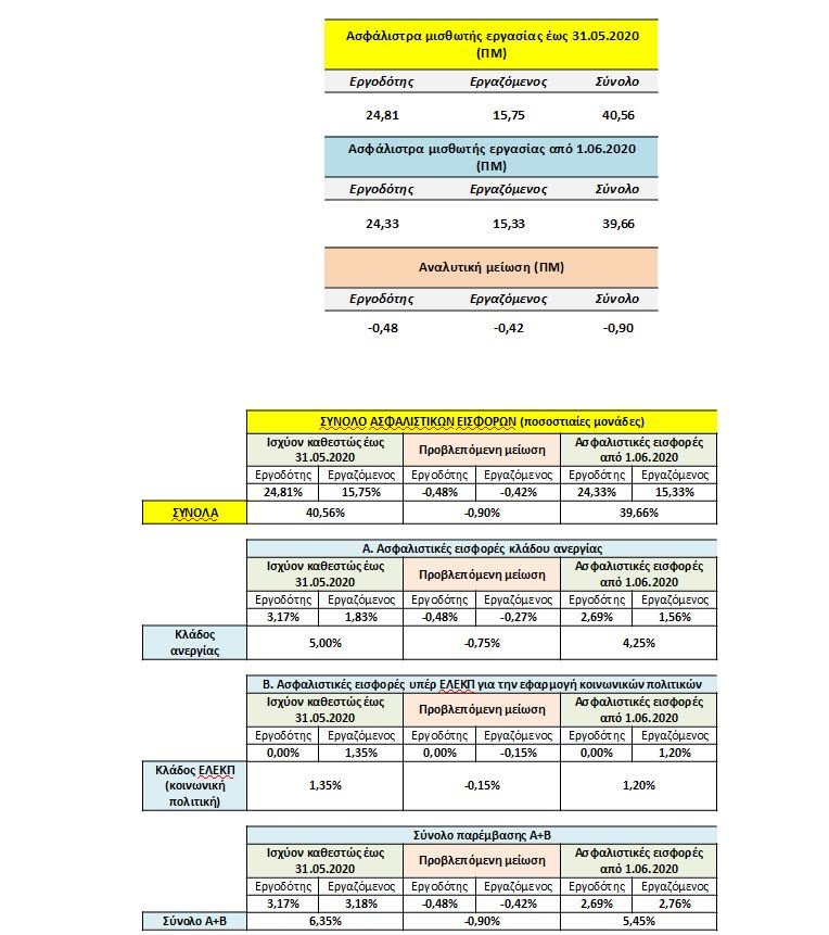 Στους παρακάτω πίνακες, που έχει ήδη ανακοινώσει το υπουργείο Εργασίας, αποτυπώνεται το σύνολο των ασφαλιστικών εισφορών, όπως διαμορφώνονται, μετά από αυτήν τη μείωση.