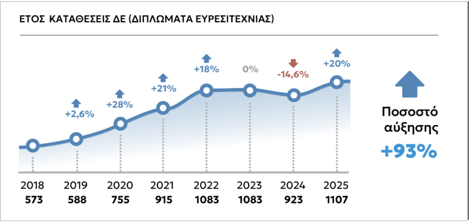 Η δυναμική αύξηση των καταθέσεων Διπλωμάτων Ευρεσιτεχνίας και Εμπορικών Σημάτων και το 2025 καταδεικνύει με σαφήνεια ότι οι χρήστες του συστήματος βιομηχανικής ιδιοκτησίας (φυσικά πρόσωπα, επιχειρήσεις, πανεπιστήμια και ερευνητικά κέντρα) αναγνωρίζουν όλο και περισσότερο τη σημασία και τα οφέλη που απορρέουν από την προστασία της διανοητικής τους ιδιοκτησίας.