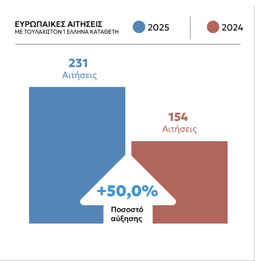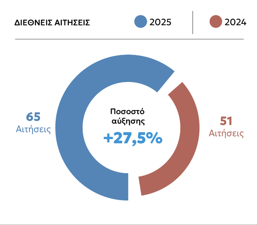 Κατατέθηκαν συνολικά 65 διεθνείς αιτήσεις με τουλάχιστον έναν Έλληνα δικαιούχο, έναντι 51 καταθέσεων, με τουλάχιστον έναν Έλληνα δικαιούχο, που παρελήφθησαν το 2024.