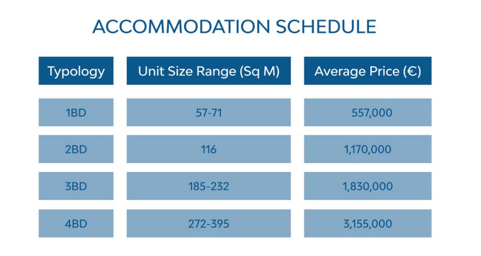 Οι τιμές αγοράς ξεκινούν από €485.000 και φτάνουν έως τα €4,5 εκατ., ενώ οι τιμές ανά τ.μ. κυμαίνονται μεταξύ €6.985 και €12.500, ανάλογα με το κτίριο και την τυπολογία. Το έργο προσφέρει ένα προσεκτικά επιλεγμένο φάσμα διαμερισμάτων, όπως παρουσιάζεται στον εγκεκριμένο πίνακα τυπολογιών: