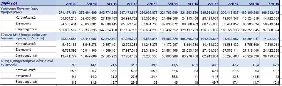 Οι αριθμοί είναι πραγματικά εντυπωσιακοί αν τους εξετάσει κανείς από την αρχή της κρίσης ως σήμερα. Σύμφωνα με τα στοιχεία της Τράπεζας της Ελλάδας, η Ελλάδα μπήκε στο τούνελ της κρίσης με υπόλοιπο δανείων περίπου 271 δις ευρώ, εκ των οποίων είχαν «κοκκινίσει» γύρω στα 26 δις ευρώ, δηλαδή το 9,5%. Εκείνη την εποχή, χωρίς να είναι κάποιος βαθύς γνώστης, μπορούσε να υποπτευθεί ότι τα περισσότερα από αυτά τα «κόκκινα» δάνεια ήταν «αμαρτίες» από διακοποδάνεια, εορτοδάνεια, πιστωτικές κάρτες και όντως τα στοιχεία επιβεβαιώνουν αυτήν την υποψία, καθώς σχεδόν τα 16 δις από 26 δις ευρώ ήταν «κόκκινα» καταναλωτικά δάνεια. Ουδείς μπορούσε, όμως, να φανταστεί τι ερχόταν…