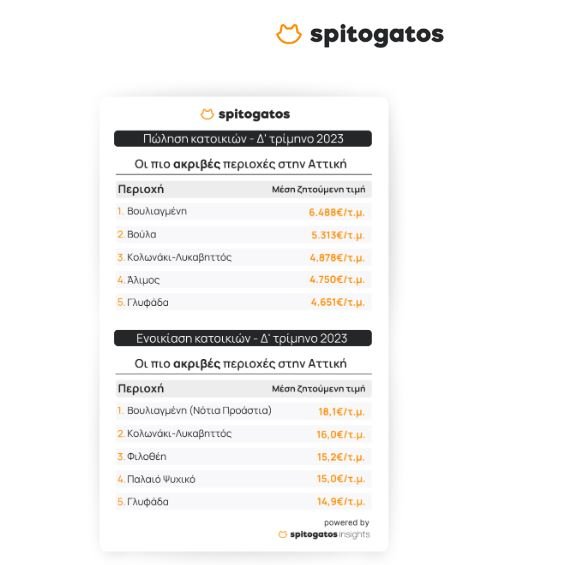 Η πιο ακριβή περιοχή της Αττικής για ενοικίαση αλλά και αγορά κατοικίας είναι η Βουλιαγμένη στα Νότια Προάστια, με μέση ζητούμενη τιμή 18,1€/τ.μ. και 6.488€/τ.μ. αντίστοιχα. Η περιοχή Κολωνάκι - Λυκαβηττός και η Γλυφάδα επίσης κατατάσσονται στις ακριβότερες περιοχές της Αττικής για ενοικίαση και για αγορά κατοικίας.