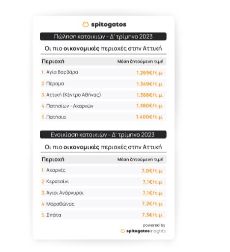 Αντίθετα, στις οικονομικότερες περιοχές για ενοικίαση κατοικίας περιλαμβάνονται οι Αχαρνές και το Κερατσίνι, ενώ για αγορά κατοικίας η Αγία Βαρβάρα και το Πέραμα. Στη Θεσσαλονίκη, οι ακριβότερες περιοχές για αγορά κατοικίας είναι η Καλαμαριά (2.765€/τ.μ.) και το κέντρο της Θεσσαλονίκης (2.593€/τ.μ.), ενώ για ενοικίαση είναι και πάλι το κέντρο της Θεσσαλονίκης (9,4€/τ.μ.) και η περιοχή Βαρδάρης – Λαχανόκηποι, με μέση ζητούμενη τιμή ενοικίασης 9,0€/τ.μ..