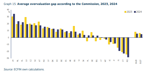Στο τέλος του 2024, οι τιμές των κατοικιών παρέμειναν υπερτιμημένες- δηλαδή «φούσκα»- σε πολλές χώρες της ΕΕ, παρά την πρόσφατη μείωση των διαφορών αποτίμησης. Οι τιμές εκτιμάται ότι είναι υπερτιμημένες κατά περίπου 35% στην Πορτογαλία, κατά 10-20 % στο Λουξεμβούργο, τις Κάτω Χώρες, την Αυστρία, την Ελλάδα, την Τσεχία, τη Σουηδία και τη Λετονία. Η Ελλάδα έχει την 3η μεγαλύτερη «φούσκα».