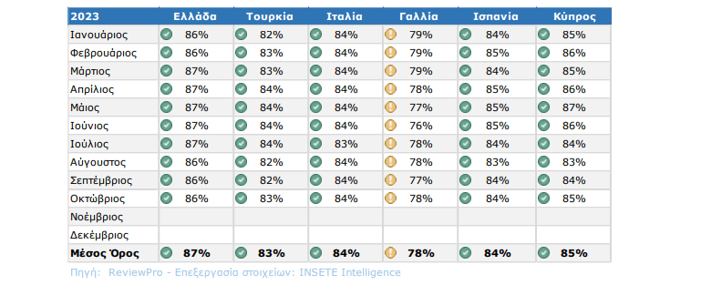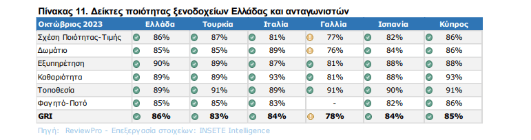 Τον Οκτώβριο του 2023, η Ελλάδα κατέχει την πρώτη θέση στο γενικό δείκτη ικανοποίησης των ξενοδοχείων με 86%, σύμφωνα με το σταστιστικό δελτιό του ΙΝΣΕΤΕ.