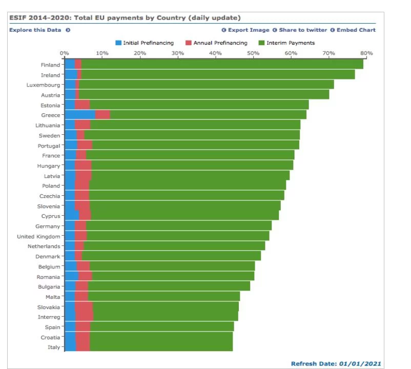 Οι επιδόσεις αυτές είχαν ως αποτέλεσμα η Ελλάδα να βρίσκεται σήμερα στην 6η θέση ανάμεσα στα 28 κράτη - μέλη της Ε.Ε., με βάση τα επίσημα στοιχεία της Ευρωπαϊκής Επιτροπής (https://cohesiondata.ec.europa.eu/overview).