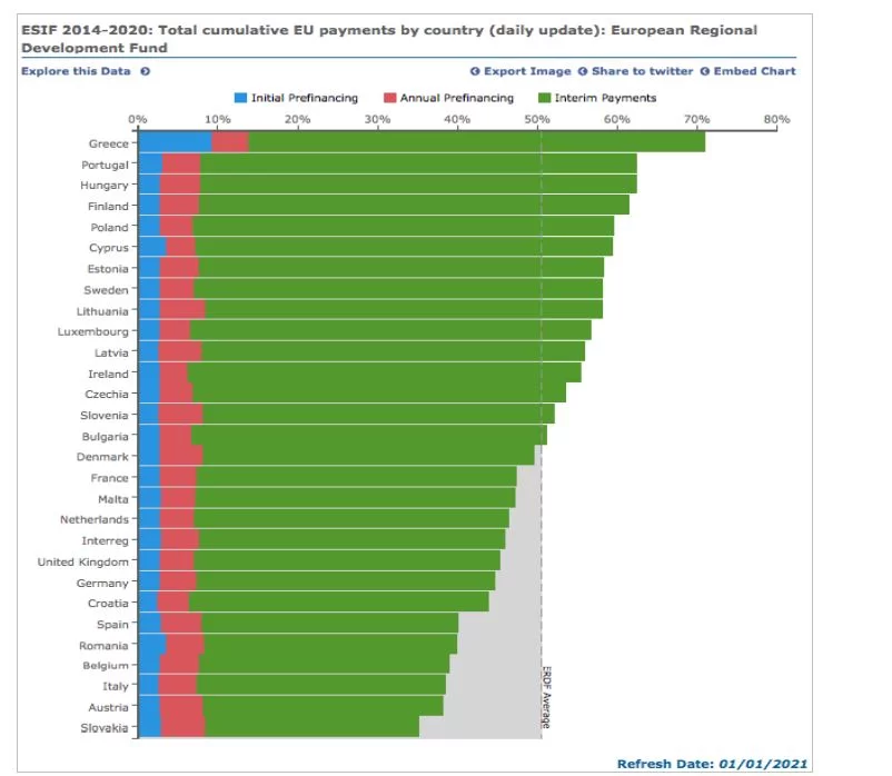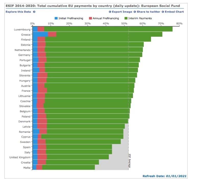 Ειδικότερα, στην απορρόφηση των πόρων του Ευρωπαϊκού Ταμείου Περιφερειακής Ανάπτυξης (ΕΤΠΑ-ERDF) και του Ευρωπαϊκού Κοινωνικού Ταμείου (ΕΚΤ-ESF), η Ελλάδα κατέχει την πρώτη (https://cohesiondata.ec.europa.eu/funds/erdf) και τη δεύτερη θέση (https://cohesiondata.ec.europa.eu/funds/esf), αντίστοιχα, όπως παρουσιάζεται και στα σχετικά διαγράμματα.