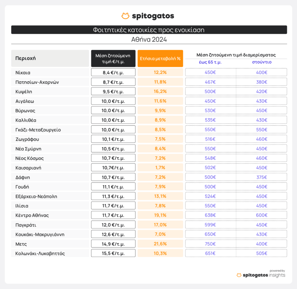 Ειδική κατηγορία η φοιτητική στέγη, η οποία σύμφωνα με τα στοιχεία του spitogatos, είναι περίπου 10% ακριβότερη από πέρσι. Ειδικά όσον αφορά στην Αττική, η μέση τιμή διαμορφώνεται στα 10,8 ευρώ/τμ. Ενδεικτικά, ένα διαμέρισμα κάτω από 65 τ.μ. στην περιοχή του Ζωγράφου, που αποτελεί μία από τις δημοφιλέστερες φοιτητικές συνοικίες λόγω εγγύτητας με την Πανεπιστημιούπολη και την Πολυτεχνειούπολη, στοιχίζει κατά μέσο όρο 516 ευρώ. Στα 400 ευρώ ανέρχεται η τιμή ενός στούντιο στην Νίκαια, που αποτελεί μία από τις οικονομικότερες περιοχές της Αττικής για αναζήτηση φοιτητικής κατοικίας.