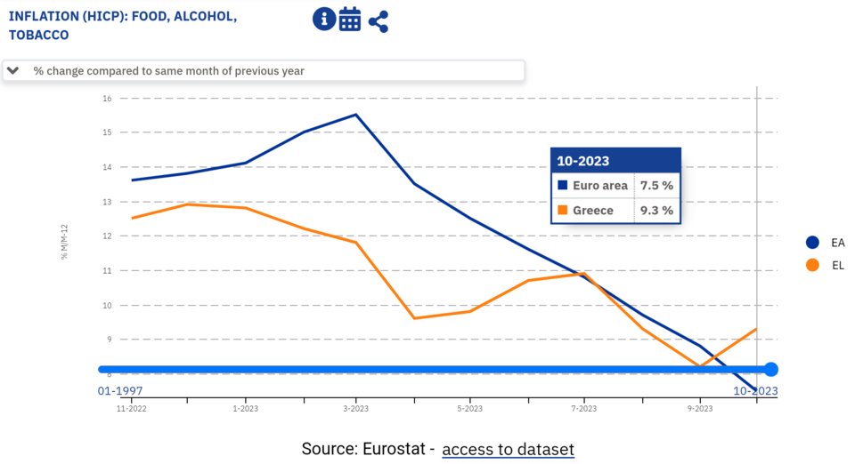 Ειδικότερα, ο πληθωρισμός κατά Eurostat επιτάχυνε στο 3,9% από 2,4% το Σεπτέμβριο. Σημειωτέτον ότι εκτός από εμάς, μόνο στην Εσθονία (5% από 3,9%) και στην Ισπανία (3,5% από 3,3%) καταγράφεται επιτάχυνση του πληθωρισμού. Όσον αφορά στα Τρόφιμα, αλκοόλ, καπνός, ο δείκτης «έτρεξε» με 9,3% από 8,2% το Σεπτέμβριο.