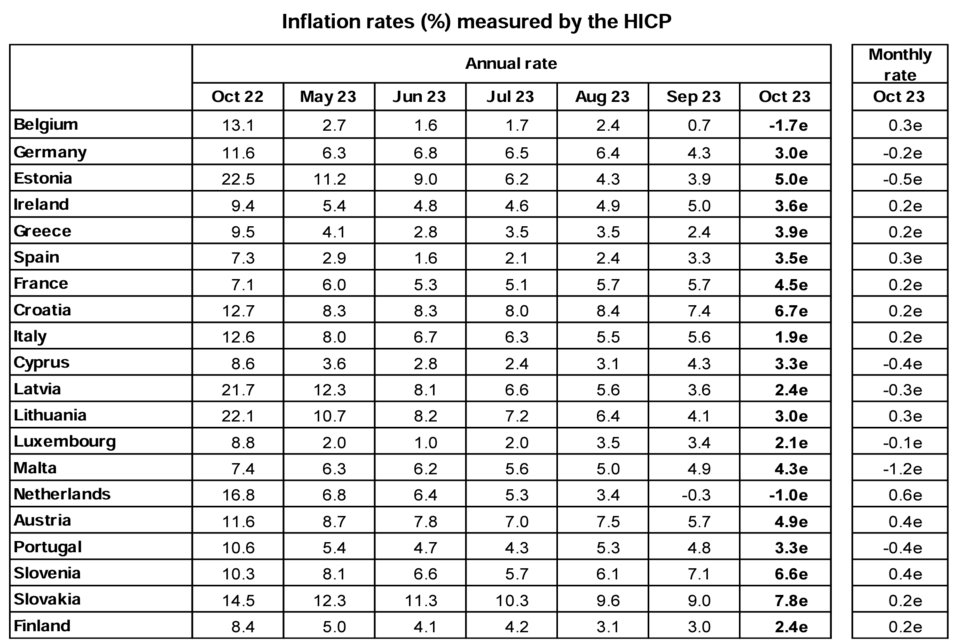 Τα πρώτα στοιχεία για τον Οκτώβριο δείχνουν ότι στο σύνολο της Ευρωζώνης ο πληθωρισμός «έτρεξε» με 2,9% από 4,3% το Σεπτέμβριο, ενώ τρόφιμα, αλκοόλ, καπνός «έτρεξαν» με 7,5% από 8,8%. Σημειωτέον ότι ο δείκτης της Ενέργειας εμφανίζεται 11,1% χαμηλότερα από πέρσι, αλλά προφανώς δεν έχουν ενσωματωθεί ακόμα οι αναταράξεις από την κρίση στη Μέση Ανατολή.