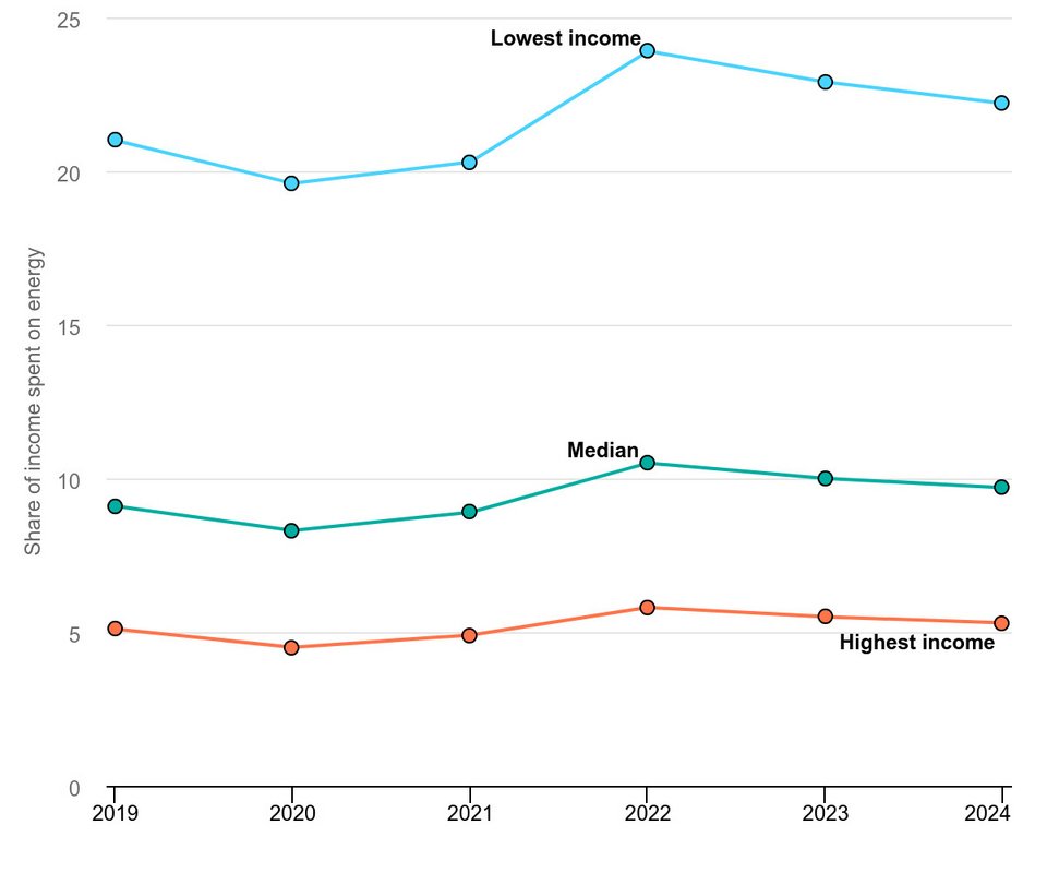 Τα νοικοκυριά με χαμηλότερο εισόδημα είναι τα πιο εκτεθειμένα στις κρίσεις των τιμών της ενέργειας. Είναι ενδεικτικό ότι στο αποκορύφωμα της ενεργειακής κρίσης του 2022, τα νοικοκυριά με χαμηλό εισόδημα στις προηγμένες οικονομίες δαπάνησαν περίπου το ένα τέταρτο του εισοδήματός τους για ενέργεια - αύξηση 4 ποσοστιαίων μονάδων από το 2021. Αντίθετα, τα νοικοκυριά μεσαίου εισοδήματος δαπάνησαν περίπου το 10% του εισοδήματός τους για ενέργεια, με αύξηση μικρότερη από 2 ποσοστιαίες μονάδες.