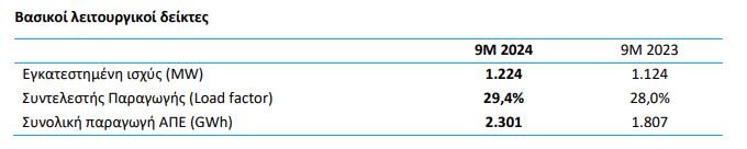 Η εγκατεστημένη ισχύς στο τέλος του Σεπτεμβρίου του 2024 ανήλθε σε 1.224 MW έναντι 1.124 MW στο τέλος του Σεπτεμβρίου του 2023. Υπενθυμίζεται ότι το έργο του Καφηρέα ισχύος 327 MW ηλεκτρίστηκε πλήρως στο τελευταίο τρίμηνο του 20232 .