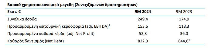Τα προσαρμοσμένα καθαρά κέρδη χρήσης από συνεχιζόμενες δραστηριότητες διαμορφώθηκαν σε € 52,3 εκατ., αυξημένα κατά 45,3% σε σχέση με την αντίστοιχη του προηγούμενου έτους (€ 36,0 εκατ.). Οι λειτουργικές ταμειακές ροές του Ομίλου από συνεχιζόμενες δραστηριότητες για το Εννεάμηνο του έτους ανήλθαν σε € 137,5 εκατ., σε συνέχεια της βελτιωμένης λειτουργικής κερδοφορίας.