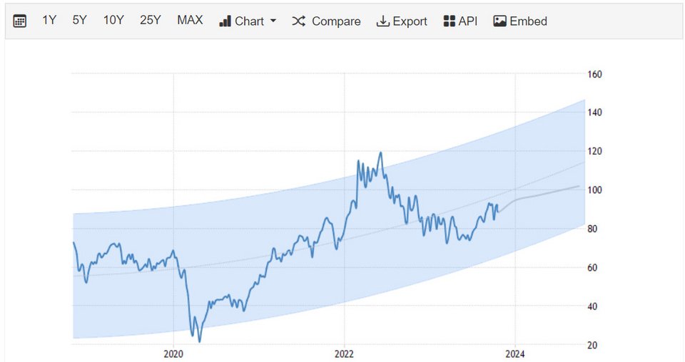 Σύμφωνα με την Trading Economics, το Brent αναμένεται να διαπραγματεύεται στα 94,57 δολάρια μέχρι το τέλος του τρέχοντος τριμήνου, ενώ εκτιμάται ότι θα διαπραγματεύεται στα 101,93 δολάρια σε 12 μήνες, με ό,τι συνεπάγεται φυσικά αυτό για τις λιανικές τιμές των καυσίμων, τα κόστη μεταφορών και τα κόστη παραγωγής.