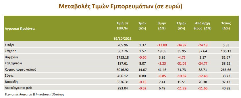 Όσον αφορά στη ζάχαρη, που κινείται σε υπερδιπλάσια τιμή σε σχέση με τα προ κρίσης επίπεδα, είναι πιθανό η σύσφιγξη στην προσφορά (παραγωγή και αποθέματα) σε σχέση με τη ζήτηση, να ενισχύσει την τιμή της. Παράλληλα, οι ανησυχίες της αγοράς για τον βραδύτερο ρυθμό των βραζιλιάνικων εξαγωγών ζάχαρης, λόγω προβλημάτων που παρατηρούνται στην εφοδιαστική αλυσίδα (δυσμενείς καιρικές συνθήκες στην φόρτωση των πλοίων στα λιμάνια της Βραζιλίας) αποτελούν έναν ακόμη ανοδικό κίνδυνο για την τιμή της, κάτι που αποτυπώθηκε πρόσφατα στην τιμή της σε υψηλό ενός μήνα.