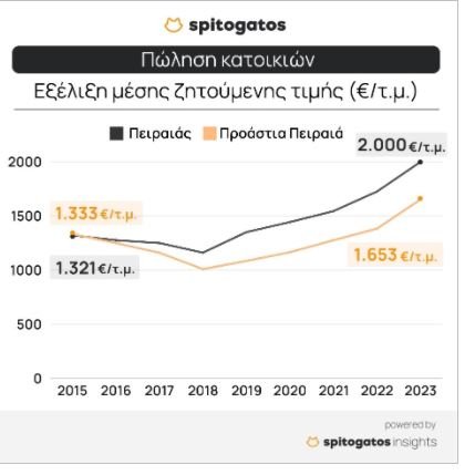Στις πωλήσεις κατοικιών η εξέλιξη των τιμών από το 2015 μέχρι το 2023 είναι ελαφρώς διαφορετική, με τη μέση ζητούμενη τιμή πώλησης κατοικιών στον Πειραιά και τα Προάστιά του να σημειώνει μείωση μέχρι το 2018. Μετά το 2018, η πορεία των μέσων ζητούμενων τιμών τόσο στον Πειραιά όσο και στα Προάστιά του είναι αυξητική, με τις μέσες ζητούμενες τιμές σήμερα να διαμορφώνονται στα 2.000€/τ.μ. και 1.653€/τ.μ. αντίστοιχα.