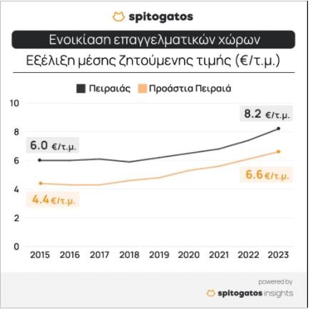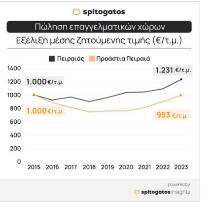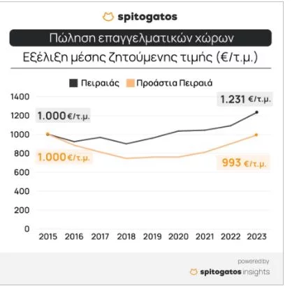 Αύξηση της μέσης ζητούμενης τιμής ενοικίασης και πώλησης επαγγελματικών ακινήτων σημειώθηκε το 2023 στον Πειραιά και τα Προάστιά του. Πιο συγκεκριμένα, αύξηση κατά 12,8% καταγράφηκε στη μέση ζητούμενη τιμή πώλησης επαγγελματικών ακινήτων στον Πειραιά (1.231€/τ.μ.), ενώ κατά 10,3% αυξήθηκε η αντίστοιχη τιμή στα Προάστια του Πειραιά (993€/τ.μ.).