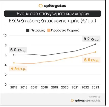 Όσον αφορά την ενοικίαση, το 2023 η μέση ζητούμενη τιμή διαμορφώθηκε στα 8,2 ευρώ/τ.μ., αυξημένη κατά 11,3% σε σχέση με το 2022, ενώ στα Προάστια του Πειραιά η μέση ζητούμενη τιμή ενοικίασης επαγγελματικών ακινήτων φτάνει τα 6,6 ευρώ/τ.μ., αυξημένη κατά 7,8% σε σχέση με το προηγούμενο έτος.